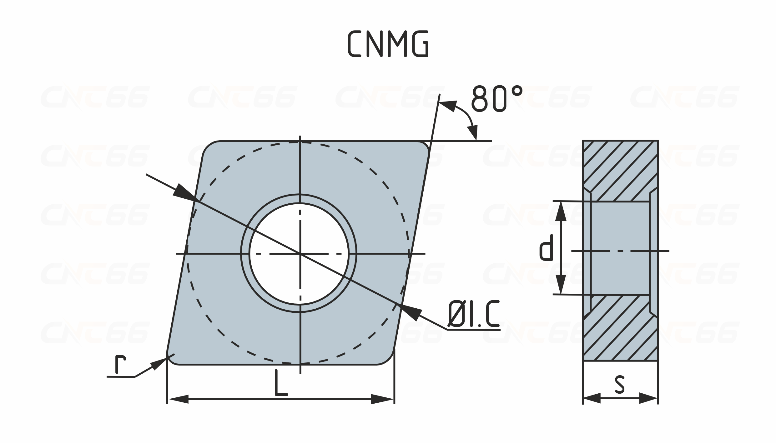 Твердосплавные токарные пластины CNMG применяются как для наружного точения (первый выбор), так и для растачивания. Форма пластины - С (ромб 80°). Негативная геометрия, задний угол 0°. Область применения: проходные державки CCLNR/L, DCBNR/L, DCKNR/L, DCLNR/L, DCMNN, ECLNR/L, MCBNR/L, MCKNR/L, MCLNR/L, MCMNN, PCBNR/L, PCLNR/L; расточные державки S...-DCLNR/L, S...-MCKNR/L, S...-MCLNR/L, S...-PCLNR/L.