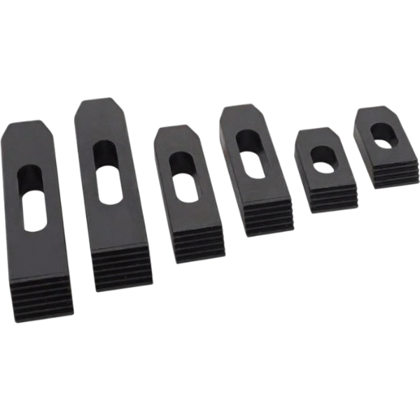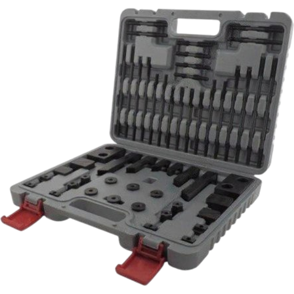 Комплект универсальных прижимов CK-16-58 предназначен для фиксации инструментальной оснастки на столах с Т-образными пазами шириной 18 мм под шпильки M16. Набор состоит из 58 предметов.